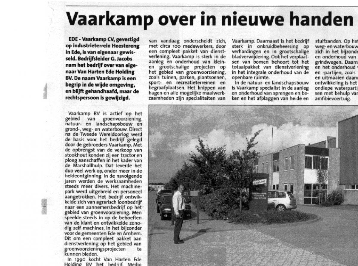 Van Harten doet het bedrijf over aan de bedrijfsleider Gert Jacobs. Het bedrijf heeft zich inmiddels verder ontwikkeld en richt zich op groen, grond en water. - Artikel uit Ede Stad