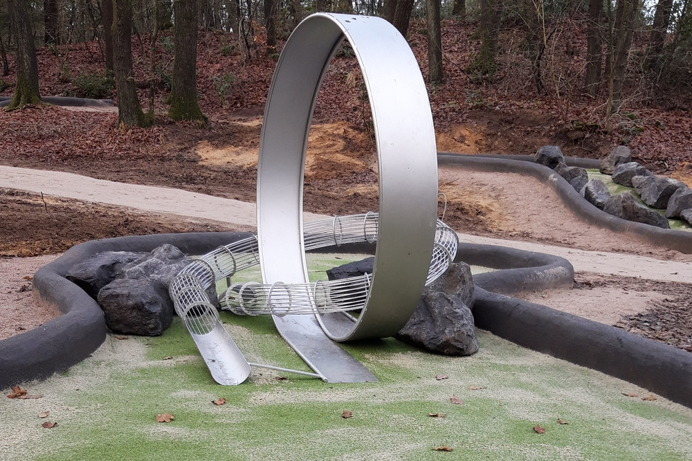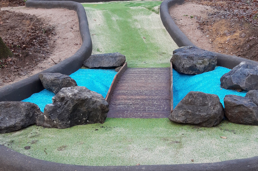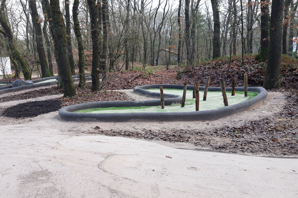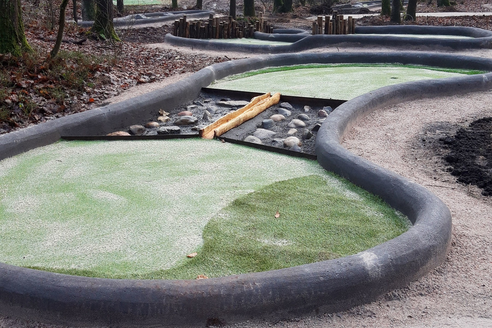 De baan is door Vaarkamp ontworpen in samenwerking met ontwerpbureau Cicom & Copier. De banen hebben natuurlijke hindernissen in de vorm van keien, hout, een brugje en een looping die we bij verschillende Adventure Golfbanen hebben toegepast. De baan zelf is van kunstgras in verschillende hoogtes waardoor er een extra dimensie ontstaat.