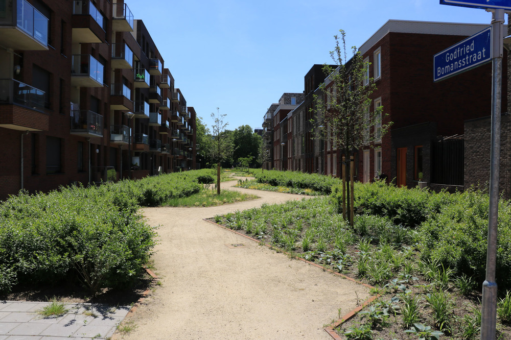 Het parkje was verder grotendeels gereed en aangelegd door een andere partij. Fraaie brede betonnen banden omsluiten de plantvakken, de Godfried Bomansstraat betreft een wandelpad naar de Brouwershof. Hier verspringen de plantvakken door een kantopsluiting van CorTenstaal.