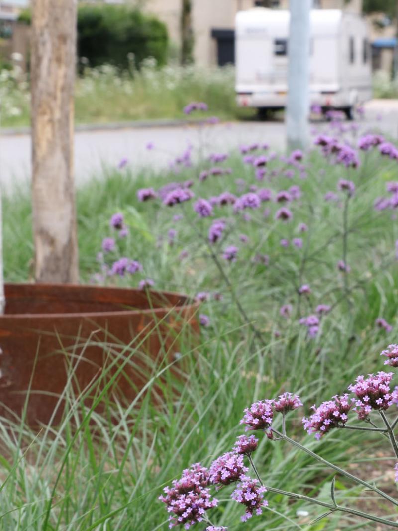 Zo plantten we aan het begin van de wijk planten als Verbena bonarensis en Pennisetum alopecuriodes als blikvanger. Langs fietsroutes pootten we kleurrijke bollen met verschillende bloeitijden en Geranium cantabrigiense.