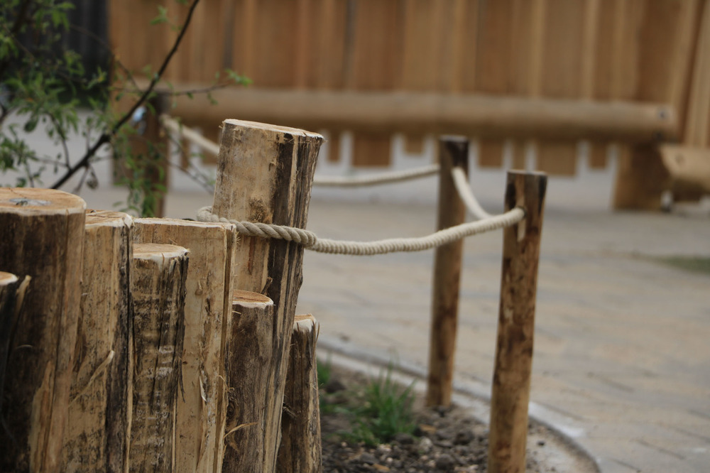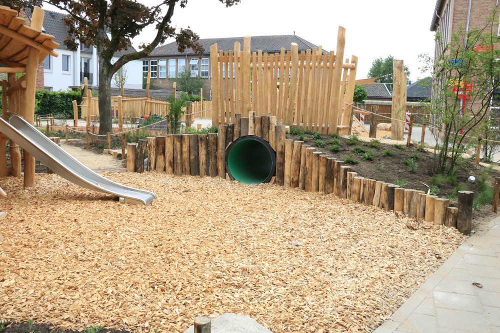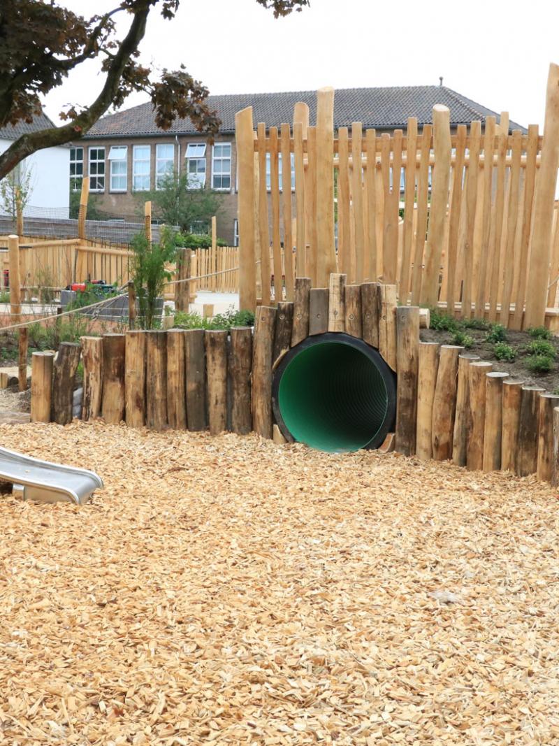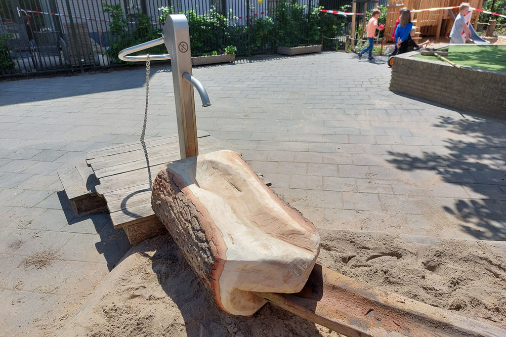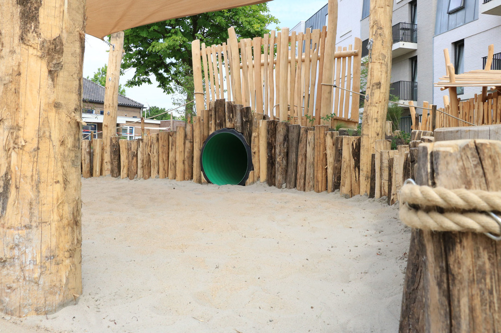 Voor de brug over de tunnel werd een verhoging gecreëerd, ernaast een zandbak met een tarp erboven. Een boomstam werd vervangen die dient als goot bij de waterpomp. Hier was sprake van nieuw voor oud en een mooie klus voor de boomverzorger.