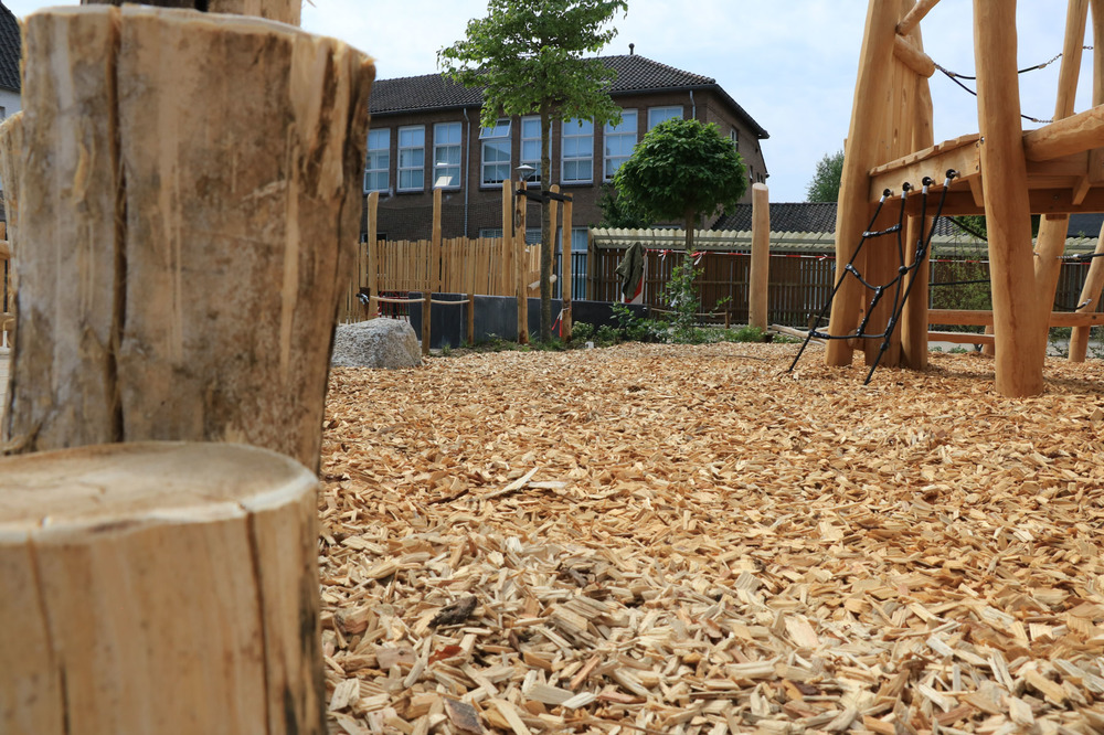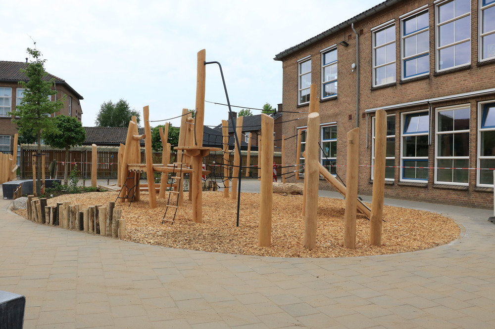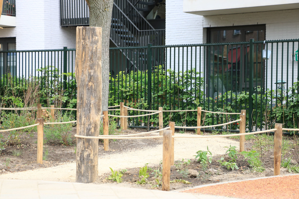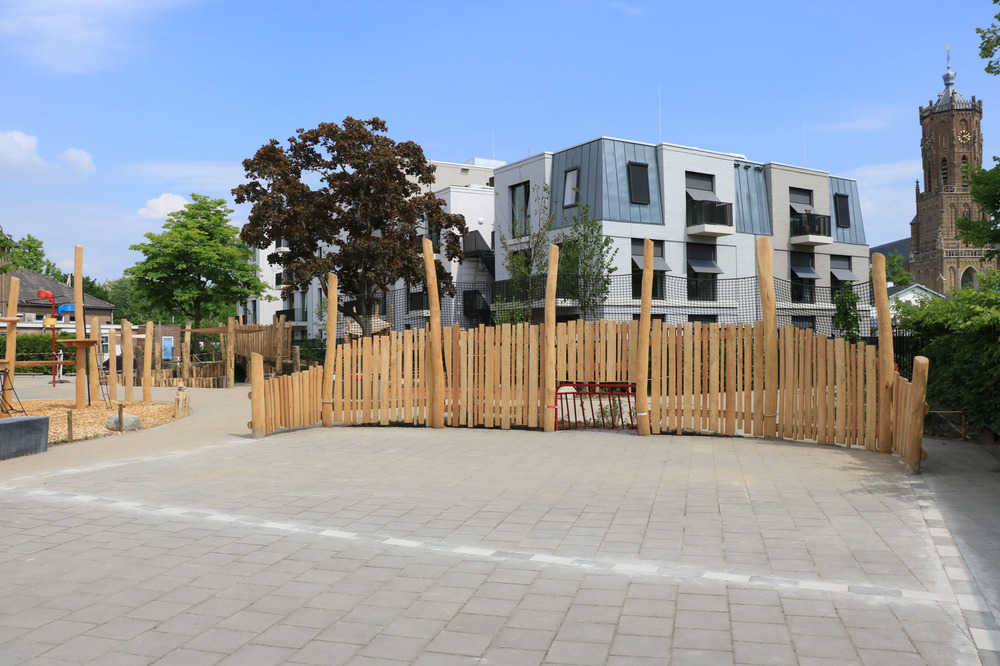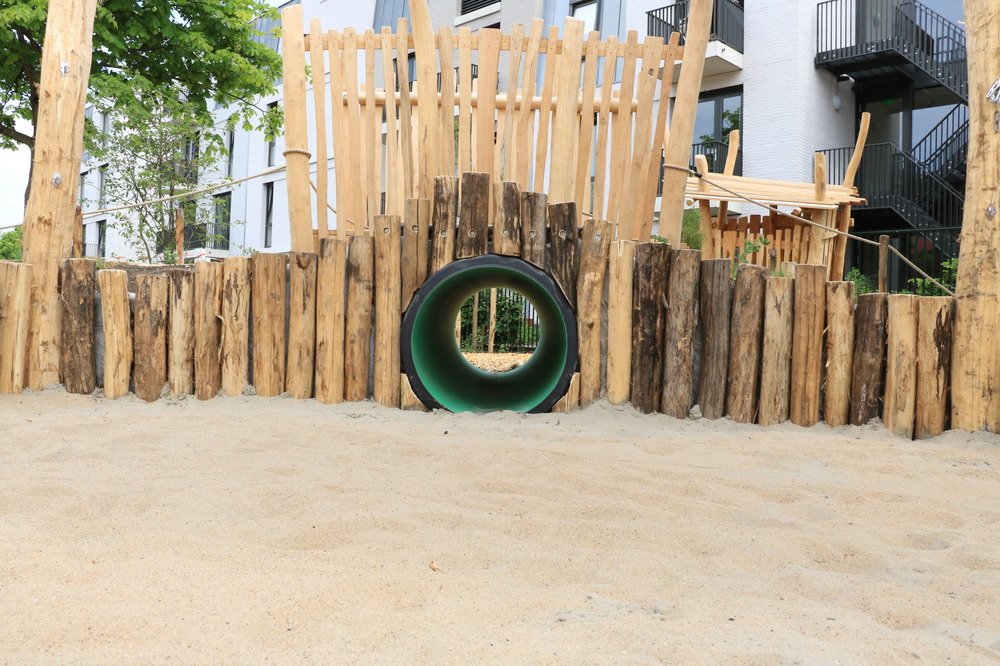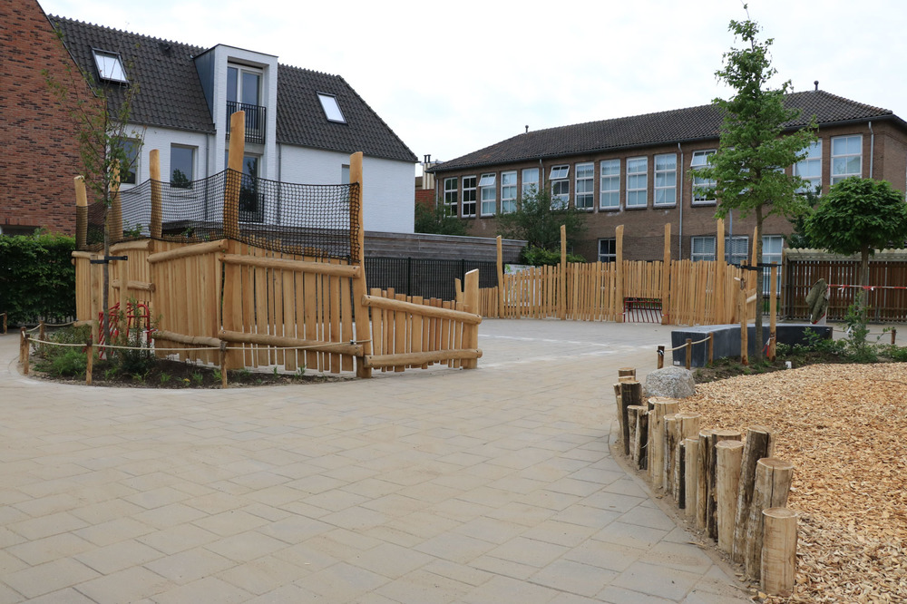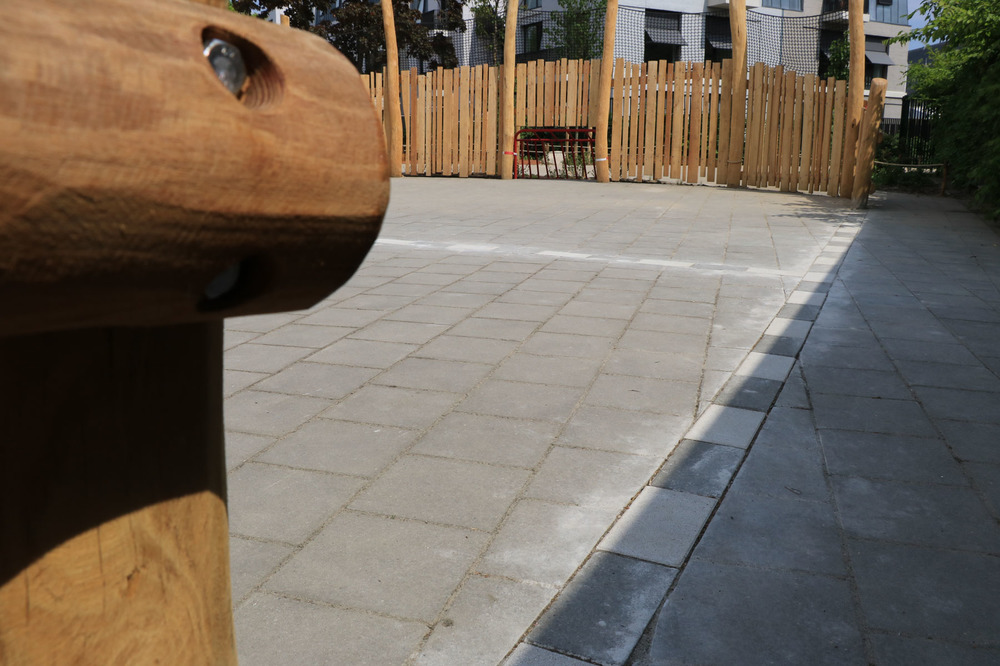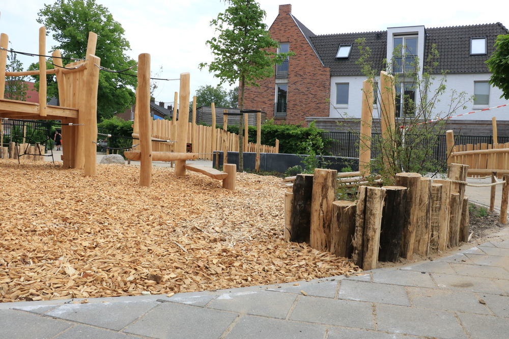 Verharding werd verwijderd om plaats te maken voor speeltoestellen en groenzones. Ook het straatwerk voor het nieuwe voetbalveld werd aangepakt voor een duurzame veldverdeling. We plaatsten palissaden van geschild hout en betonnen zitelementen langs de speelsegmenten op andere plaatsen maakten we gebruik van een combinatie van touw en palen.