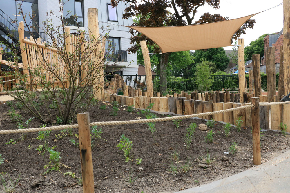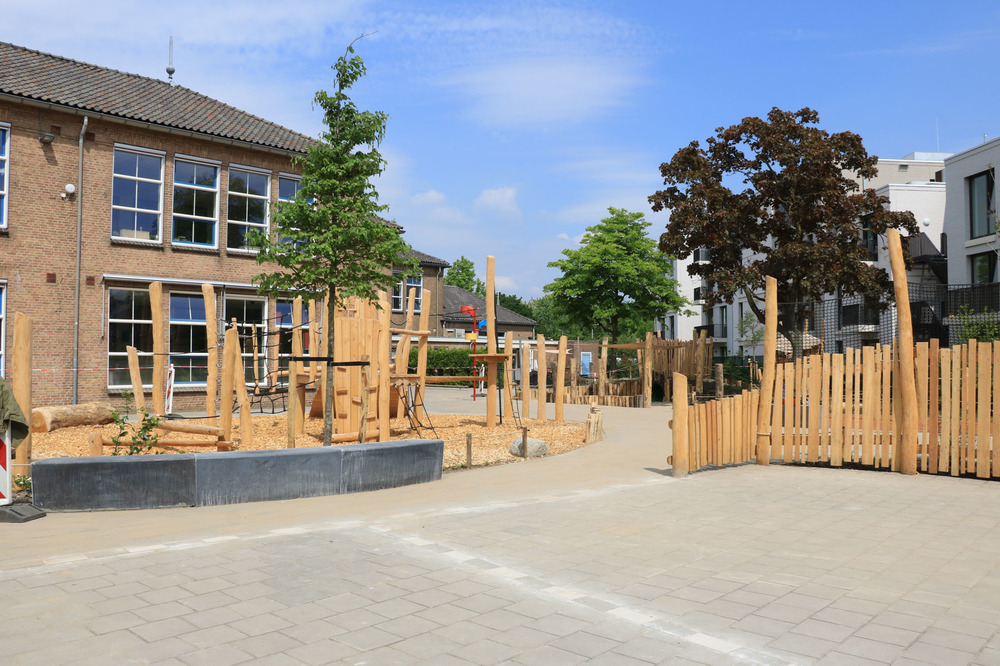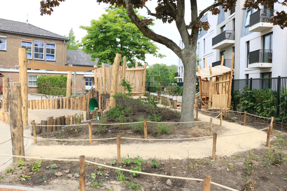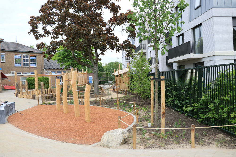 Bureau RIS zorgde voor het ontwerp. Het voetbalveld en een klim- en klautertoestel moedigen aan tot beweging. Rust vinden de kinderen in een groene zone door een struinpaadje met natuurlijke beplanting en een zandbak. Natuurlijk spelen is verder vertaald in een houten klimtoestel, een brugje en zelfs de ballenvangers zijn van hout. De aanleg van hoekjes met beplanting maakt de natuurlijke beleving compleet. Speeltoestellen werden via de opdrachtgever geleverd en geplaatst, Vaarkamp zorgde voor de overige inrichting.