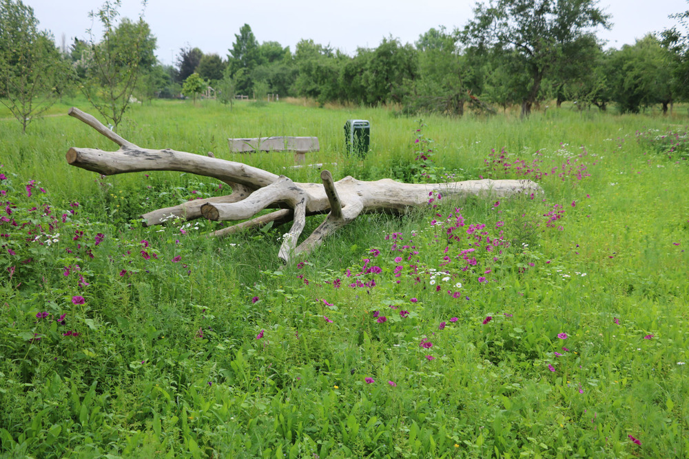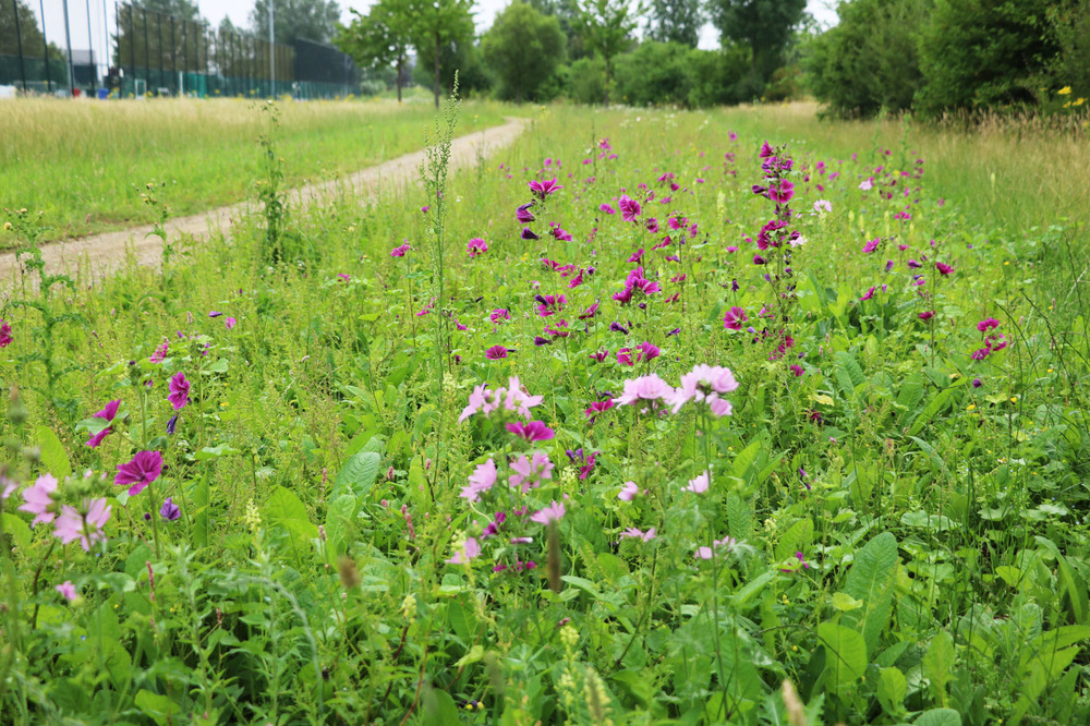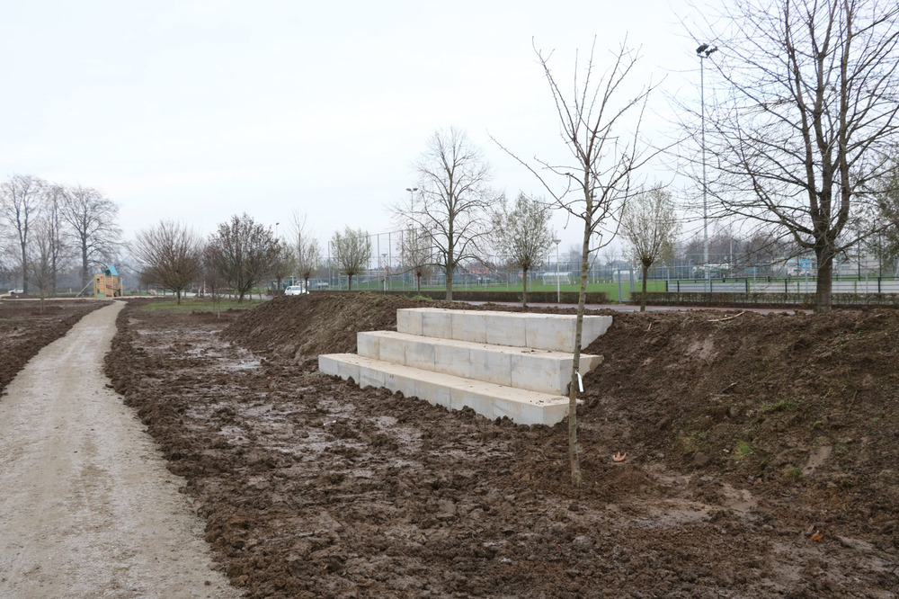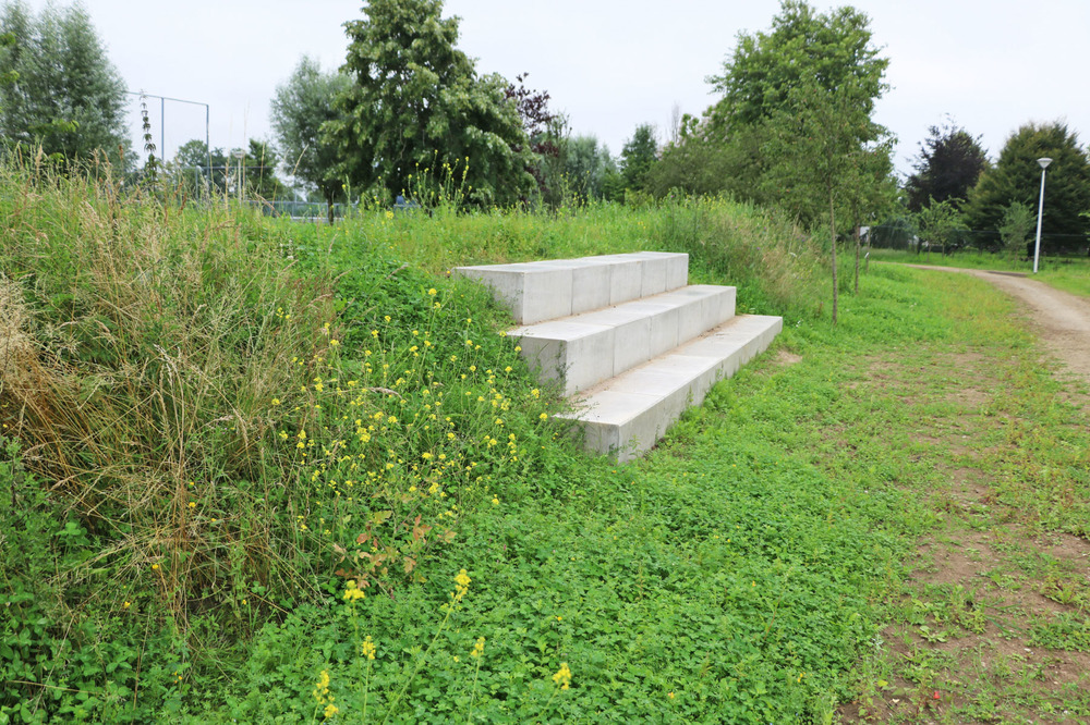 Beplanting en gazons versterken het natuurlijke beeld doordat ze zijn ingezaaid met een bloemenmengsel. De grasheuvels met zit-/trapelementen versterken de parkachtige groenbeleving.