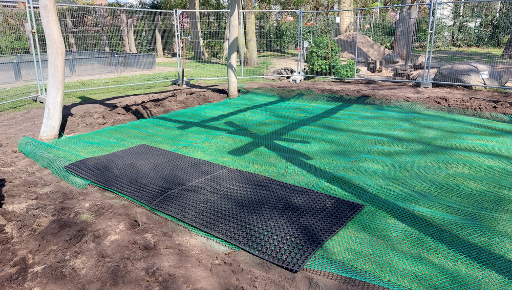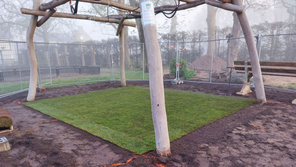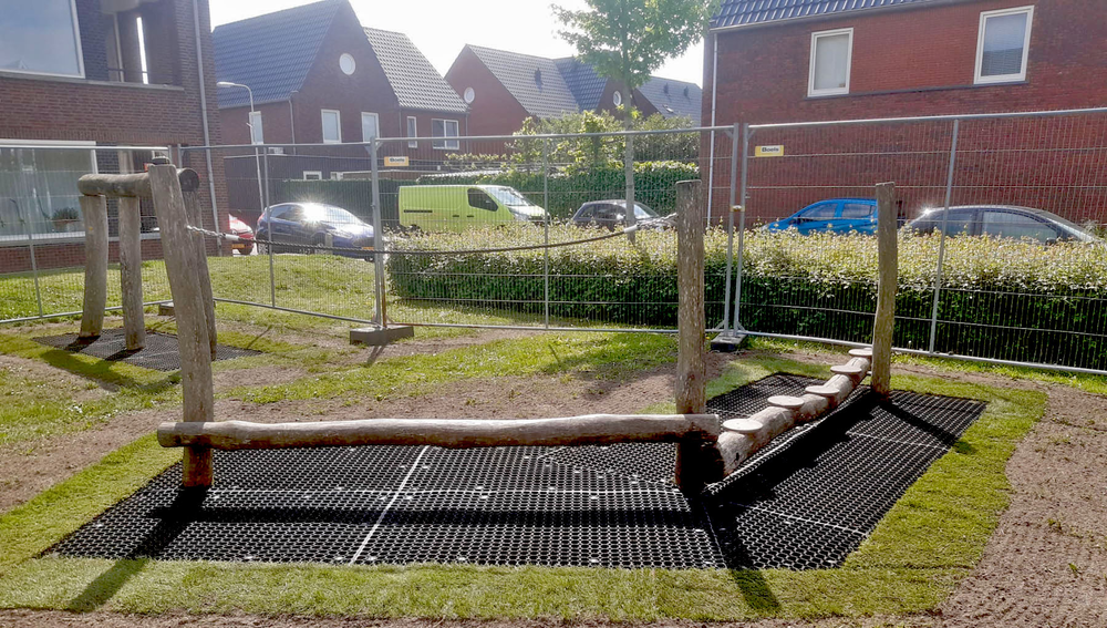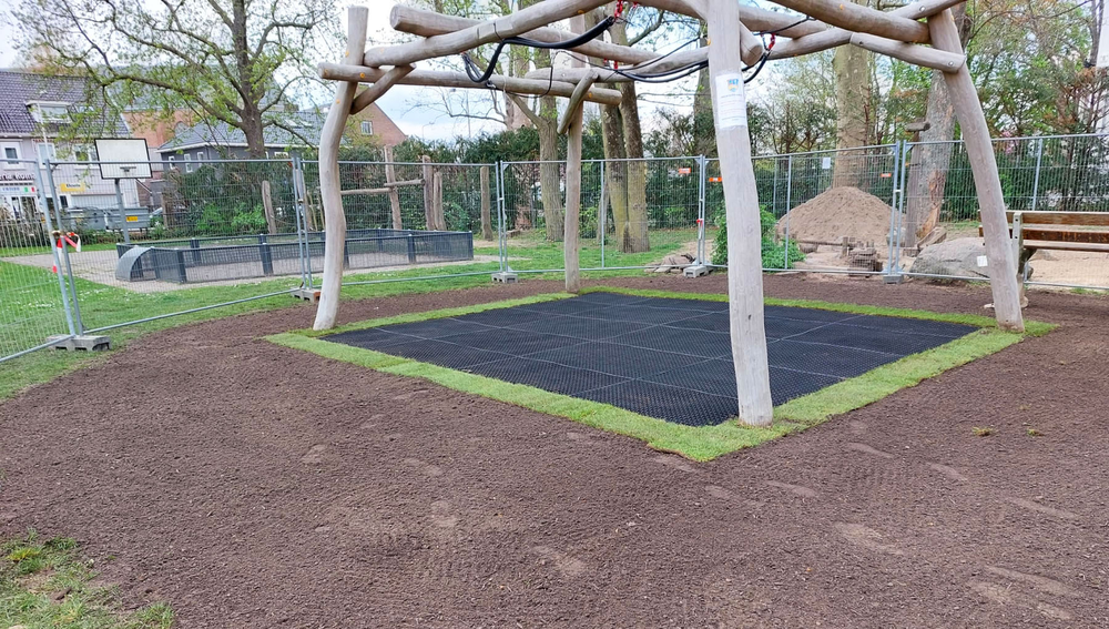 Er is 1.191 m2 valzand omgevormd tot gazon. Hiervoor is het valzand afgegraven en aangevuld met met teelaarde. Daarover ligt de nieuwe valondergrond die bestaat uit een drukverdelend net en rubberringmatten. De dubbele laag voorkomen het wegzakken en de open structuur zorgt ervoor dat het gras erdoor groeit. Het maaien van het gras vormt geen probleem doordat de randen ondergronds zijn verwerkt wat ook struikelen voorkomt.