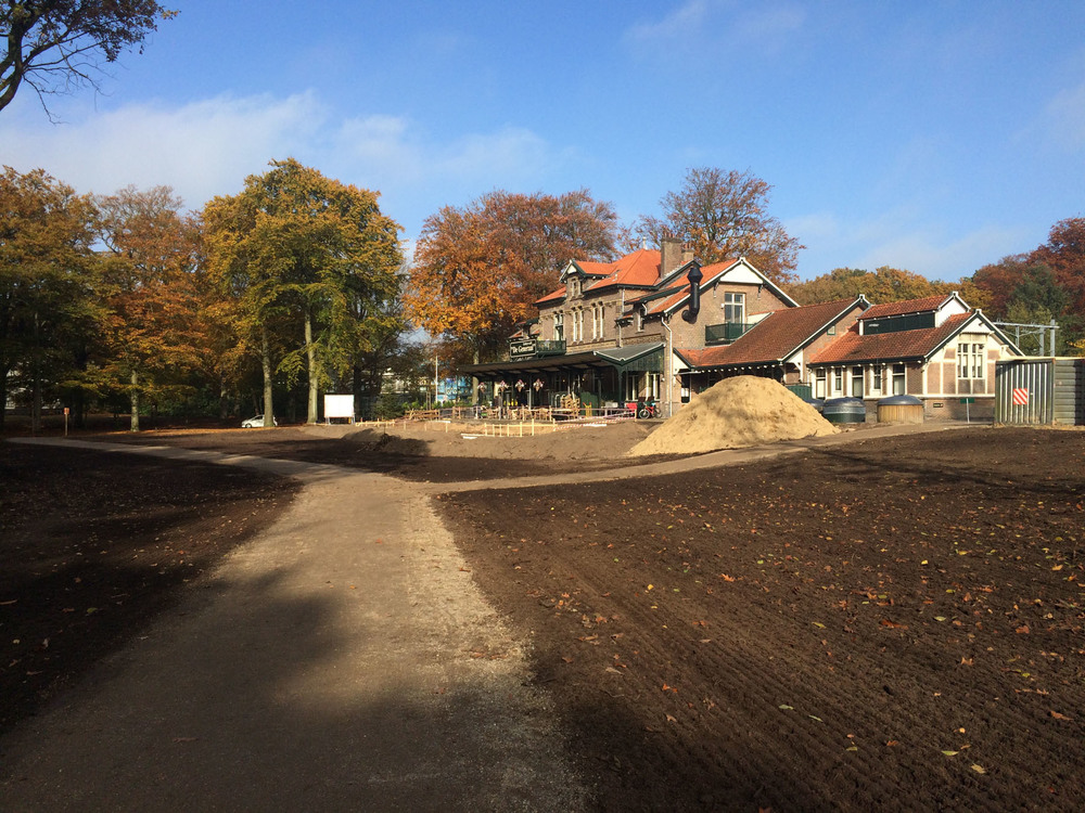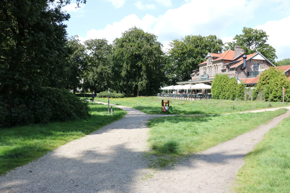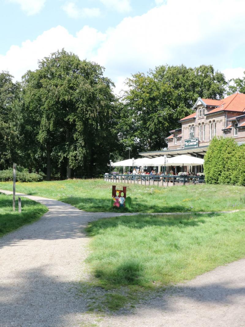 Vanaf de parkeerplaats bij Eethuys-Café De Generaal loopt er vanaf de informatiezuil een halfverhard pad het bos in. Hier is een ruiterpad verlegd om ruimte te geven aan de wandelaar. Het eetcafe ligt nu te baden in het zonlicht en lag destijds meer verscholen tussen de bomen.