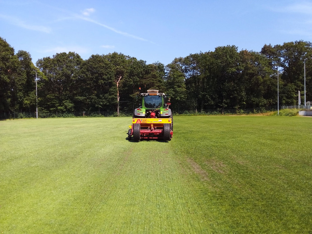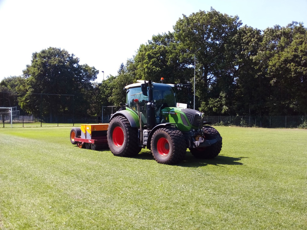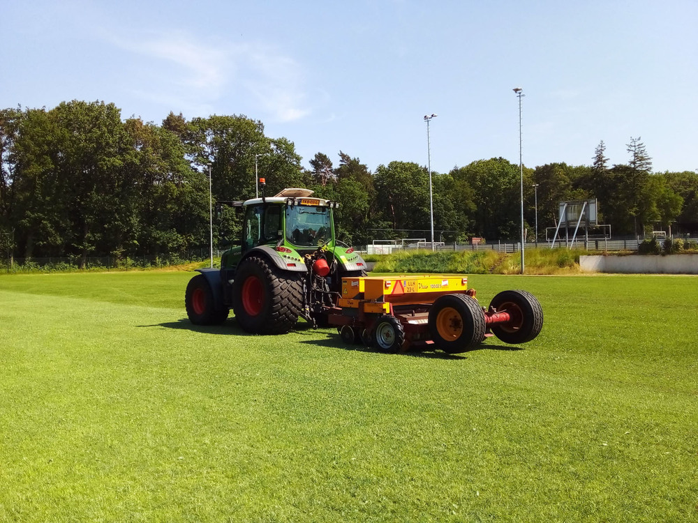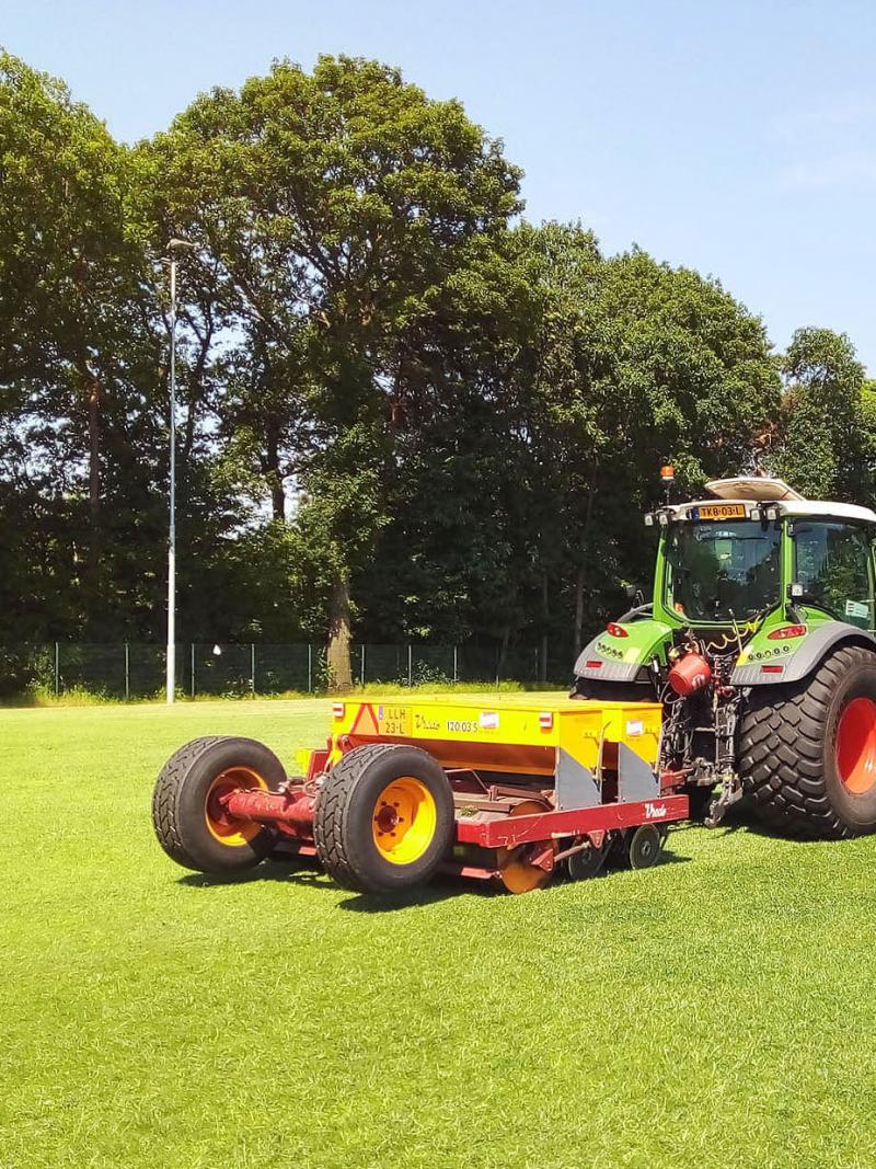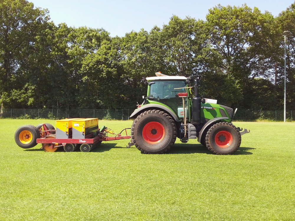 Trekker met dubbele Vredo-doorzaaimachine voor sportvelden.