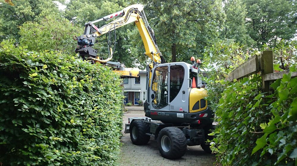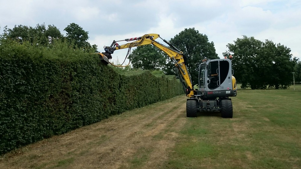 We mulchen met een 14 tons, 6,5 tons mobiele kraan of met een werktuigdrager van iets meer dan 1000 kg. De inzet is afhankelijk van het type haag of wat het resultaat moet zijn.